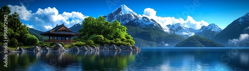 Fototapeta premium A serene mountain landscape reflecting in calm waters, surrounded by lush greenery and a tranquil pavilion.