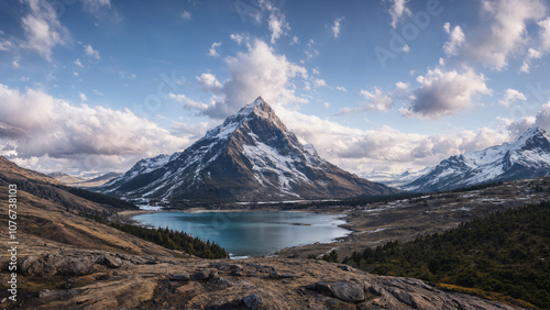 Naklejka premium A serene mountain landscape with a snowy peak, surrounded by rugged terrain....