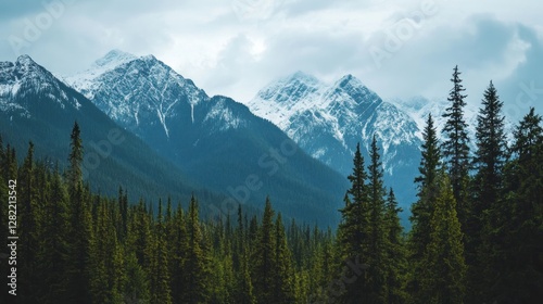 Obraz premium A serene mountain landscape with snow-capped peaks and dense evergreen forests.