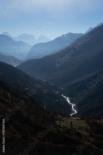 Naklejka premium A serene mountain range with a winding river reflecting sunlight.