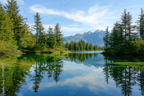 © Nomad_Soul, Obraz premium A serene mountain reflection appears in a calm lake surrounded by lush greenery. Generative AI