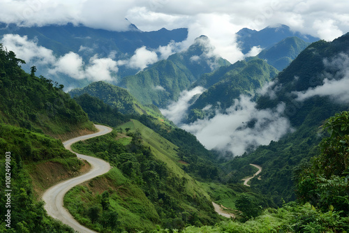 Fototapeta premium A serene mountain road curves through vibrant greenery and misty peaks at...
