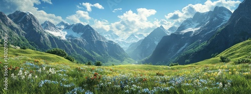 Fototapeta premium A serene mountain valley with vibrant wildflowers and majestic peaks under a...