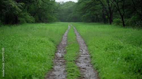 © Chanagun, Fototapeta premium A serene muddy path winds through a lush, green field surrounded by trees, inviting a peaceful exploration of nature's beauty after the rain.
