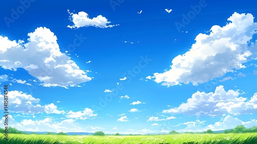 © Creative Insights, Fototapeta premium A serene natural vista featuring a clear sky and puffy clouds stretching over a vibrant green meadow.