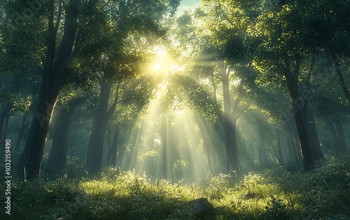 Fototapeta premium A serene nature landscape featuring sunlight filtering through towering green trees in a mystical forest, creating an enchanting atmosphere