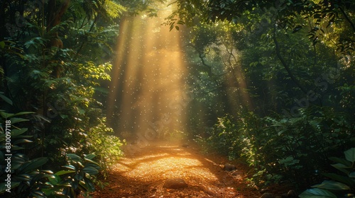 Obraz premium A serene nature path winds through a dense forest, dappled sunlight filtering through the lush canopy overhead, creating a peaceful haven for your next walk