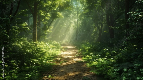 Fototapeta premium A serene nature path winds through a dense forest, dappled sunlight filtering...