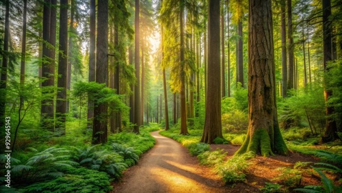 Obraz premium A serene nature trail winding through majestic forest with tall trees and...