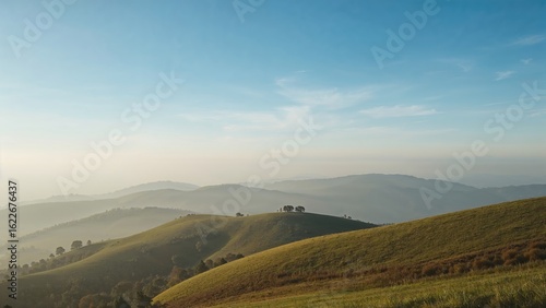 Naklejka premium A serene nature view of mist-covered hills at dawn
