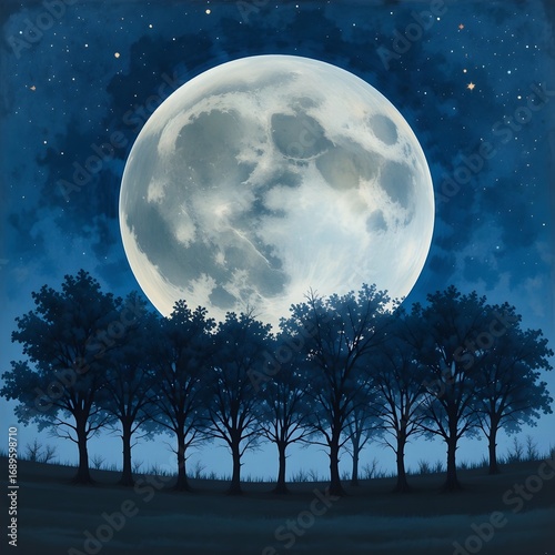 © Mehdi, Fototapeta premium A serene night landscape, depicted with a large, luminous moon and a row of dark trees against a deep blue sky, painted in watercolor style.