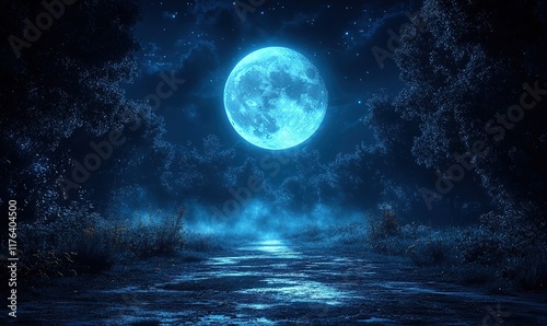 Naklejka premium A serene night scene featuring a bright blue moon illuminating a tranquil path through a forest.