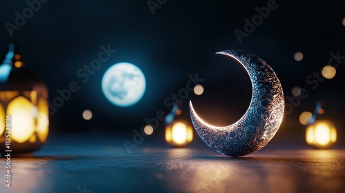 © Arda, Fototapeta premium A serene night scene featuring a crescent moon and lanterns.
