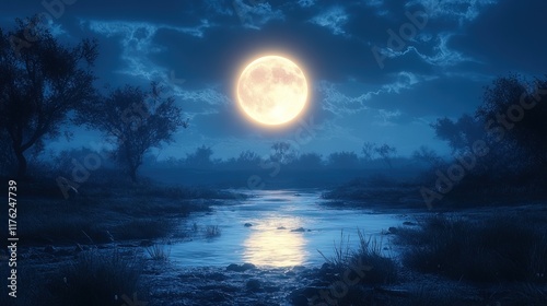 Naklejka premium A serene night scene featuring a full moon reflecting on a calm river...