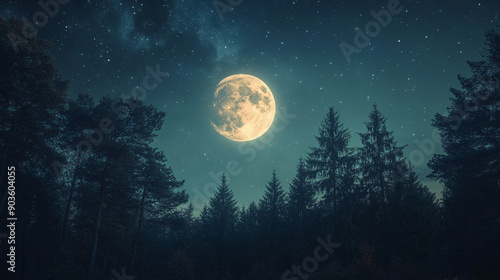 Naklejka premium A serene night scene of the moon shining above a tranquil forest, perfect for...