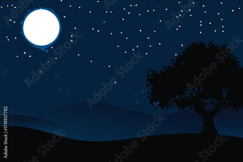 © MAYENUDDIN, Naklejka premium A serene night scene with a full moon and silhouetted tree
