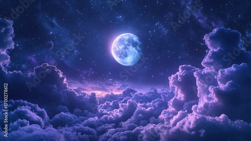 Fototapeta premium A serene night sky featuring a luminous moon surrounded by vibrant, fluffy clouds and a starry backdrop in shades of purple.