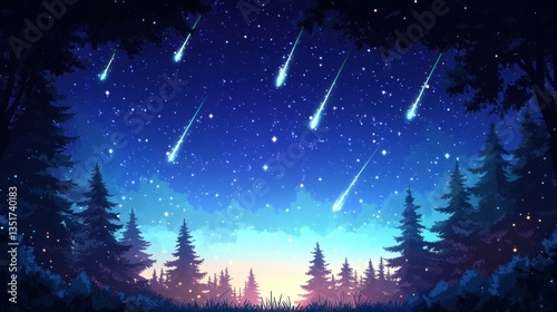 Fototapeta premium A serene night sky filled with shooting stars over a forest, creating a...