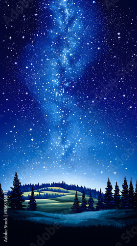 Fototapeta premium A serene night sky filled with stars over a tranquil landscape featuring rolling hills and tall trees