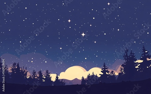 © Zue, Naklejka premium A serene night sky with a crescent moon, twinkling stars, and soft clouds