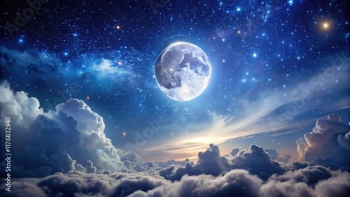 © Watcharapon, Fototapeta premium A serene night sky with a full moon and numerous stars, the moon is partially obscured by a wispy cloud, casting an ethereal glow on the scene, moon, celestial display