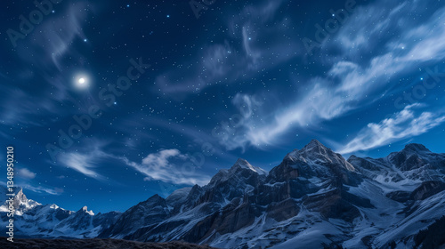 © Saeed, Obraz premium A serene night sky with a full moon and wispy clouds over mountains.