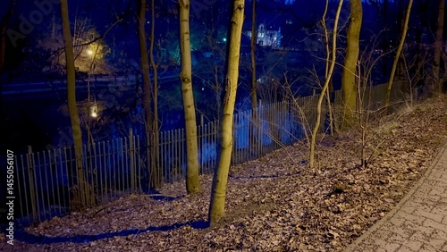 Fototapeta premium A Serene Night Walk by the Lake in the Enchanting Forest, Under the Stars and...