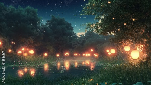 Naklejka premium A Serene Nighttime Forest Scene with Glowing Lanterns and a Reflective Pond