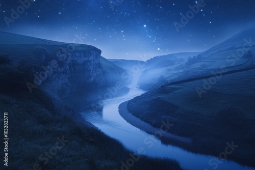 Naklejka premium A Serene Nighttime Landscape with a River Flowing Through a Valley Under a Starry Sky