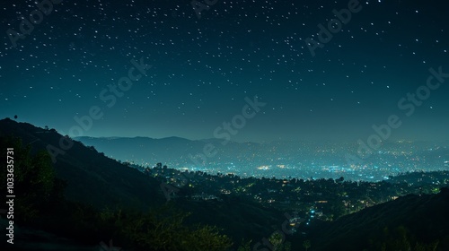 © Matthew, Naklejka premium A serene nighttime view of a cityscape under a starry sky, showcasing urban lights and distant mountains.