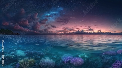 © Risa, Naklejka premium A serene ocean scene at twilight with vibrant corals and a starry sky.
