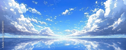 Fototapeta premium A serene ocean scene under a bright blue sky with fluffy clouds reflecting on...