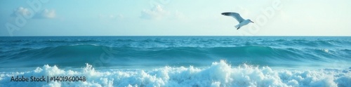 Fototapeta premium A serene ocean scene with a single seagull soaring in the air amidst waves,...