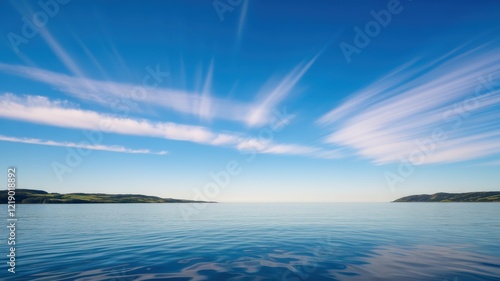 Obraz premium A serene ocean view captures a tranquil scene with gentle waves reflecting a vibrant sky filled with wispy clouds.
