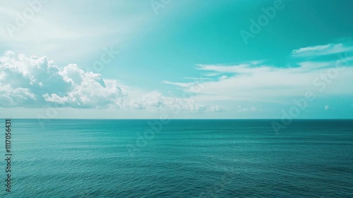 © Vista, Obraz premium A serene ocean view under a bright blue sky with fluffy clouds.