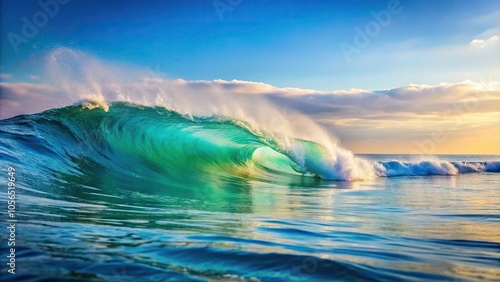 Naklejka premium A serene ocean wave breaks on the shore with a light blue horizon, ocean...