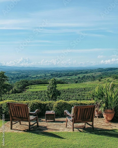 Fototapeta premium A serene outdoor seating area overlooking lush green hills.