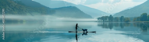 Naklejka premium A serene paddleboarding session on a calm lake with a Golden retriever and...