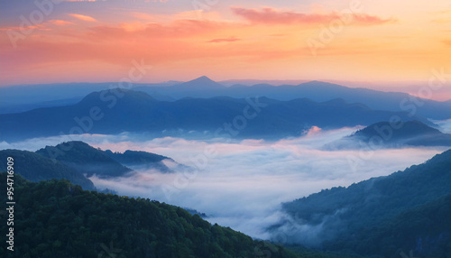 Obraz premium A serene, panoramic view of a misty mountain range during sunrise, with soft...
