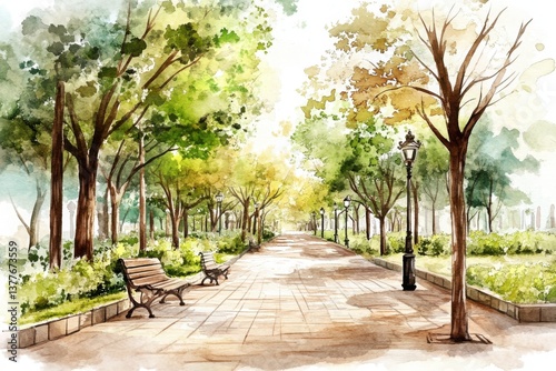 © Newstep, Obraz premium A serene park pathway lined with vibrant trees and benches, illuminated by soft sunlight, evoking a peaceful, natural atmosphere.