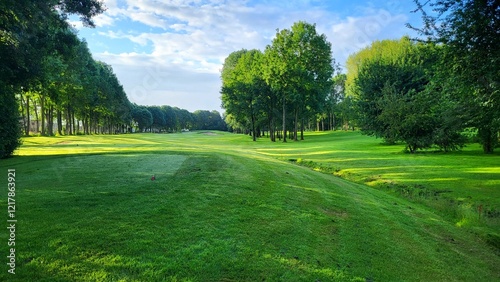 © Taras Staretskyy, Naklejka premium A serene park scene featuring expansive green lawns surrounded by tall trees. The sunlight filters through the leaves, creating a peaceful atmosphere inviting relaxation and outdoor activities.