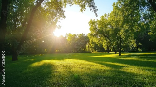 Obraz premium A serene park scene featuring lush green trees, vibrant grass, and sunlight...