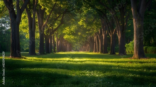 Fototapeta premium A serene park with rows of tall trees and lush green grass, leading to an...