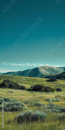 Naklejka premium A serene pastoral landscape featuring rolling green hills under clear...