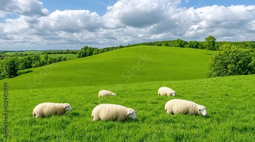 Fototapeta premium A serene pastoral scene featuring a herd of sheep grazing in a lush green...