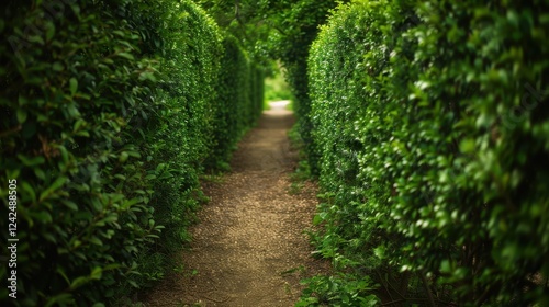 Naklejka premium A Serene Path Flanked by Lush Green Hedges in Nature
