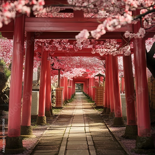 Fototapeta premium A serene path lined with vibrant cherry blossoms and traditional red torii...