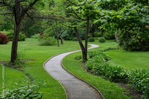 © Fotograf, Fototapeta premium A serene path surrounded by lush greenery and towering trees