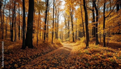 © Patcharin, Obraz premium A Serene Path Through the Woods During the Autumn Season, With Trees Displaying Vibrant Golden Foliage and Fallen Leaves on the Ground
