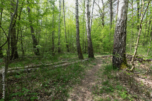 © sores, Fototapeta premium A serene path winding through a lush green forest with tall trees and sunlight.